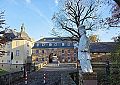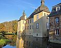 in die Vorburg führt, steht der heilige Nepomuk - wie ein Wächter über alles, was kommt und geht. Gerade jetzt im Herbst ist es dort so stimmungsvoll, am Wassergraben zu stehen. Rein ins Schloss, das im Volksmund noch immer „die Burg“ genannt wird, darf man hingegen nicht. Rings um das Gemäuer und entlang des Rotbachs herrscht zur Zeit das, was Leute, die schonmal die amerikanische Ostküste zu dieser Zeit bereist haben, den „Indian Summer der Eifel“ nennen. Das Laub der Bäume hat sich verfärbt und leuchtet in allen erdenklichen Gelb-, Braun- und Rottönen. Die Pracht der Wälder, das Bruchsteinmauerwerk von Vorburg und Remisen und der Putz des barocken Schlosstraktes gehen eine farbliche Symbiose ein, die sich im Wassergraben spiegelt. Das Licht ist weich, das Wasser still, die Atmosphäre keineswegs die eines Museums, alles wirkt auch im Vergehen des Herbstes so lebendig, als atme Schloss Eicks in dieser Landschaft.